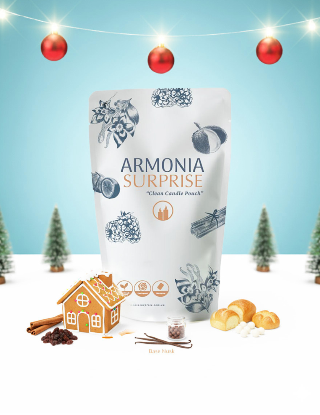 Step into the warmth of the holidays with Gingerbread House by Armonia Surprise a fragrance that captures the essence of Christmas baking and cosy moments at home. The comforting blend of spiced cinnamon and sweet raisin fills the air, perfectly balanced with notes of baked bread and malt. As it settles, the soft touch of vanilla and musk adds a creamy, nostalgic sweetness that gently lingers.